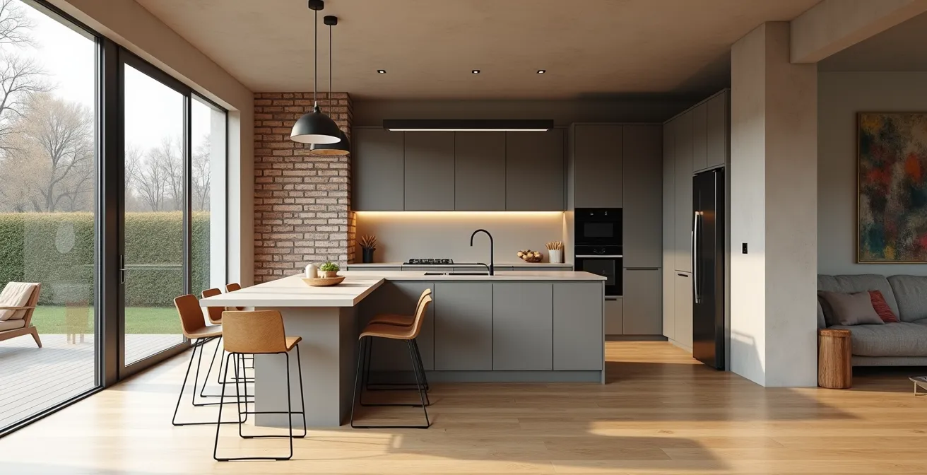 De laatste pijler van een geslaagde open leefruimte is het creëren van visuele eenheid. Zeker in de context van een typisch Vlaams rijtjeshuis, waar de leefruimte vaak lang en smal is, is het cruciaal om de keuken en woonkamer niet als twee aparte entiteiten te zien, maar als één harmonieus geheel. Dit creëert een gevoel van rust en doet de ruimte aanzienlijk groter lijken. De truc is om te werken met doorlopende lijnen en consistente materialen.